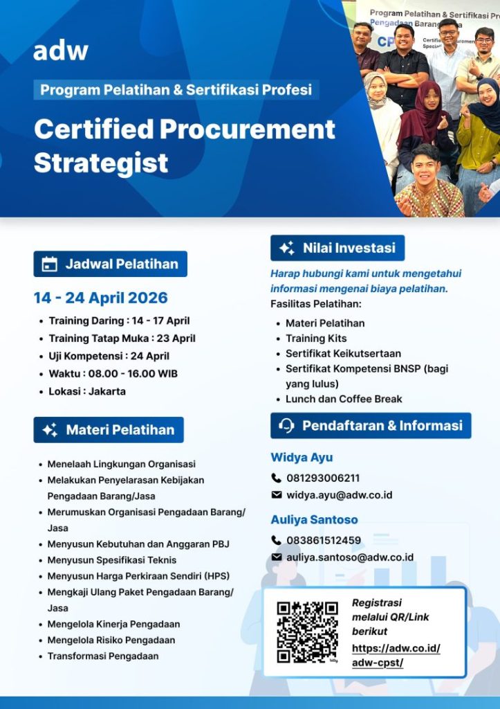 Salam Pengadaan! Di tengah dinamika bisnis yang semakin cepat, fungsi pengadaan kini dituntut untuk berperan lebih strategis, tidak hanya berfokus pada efisiensi biaya, tetapi juga pada penguatan rantai pasok, keberlanjutan, serta penciptaan nilai tambah bagi organisasi. Ke depan, pengadaan akan semakin mengedepankan proses yang agile, terintegrasi, dan berbasis digital, dengan fokus kuat pada tahap perencanaan […]